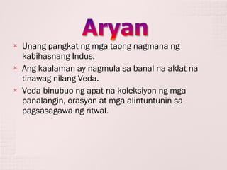 Pagsisimula ng Dinastiyang Maurya na tumagal hanggang 184 BCE. Antas ng tao sa lipunan 1. Ang unang sumakop sa India ay ang mga Aryans sila ay mga nomads na nakikipagkalakalan sakay ang kanilang mga kabayo.