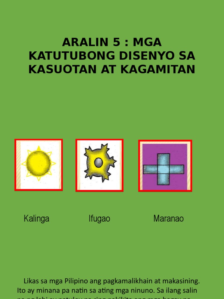 May mga disenyong tulad ng araw kidlat isda ahas butiki puno at aso na makikita sa kasuotan at kagamitan. Melc based lesson for 2 days. Pagkakapareho at pagkakaiba ng disenyo ng gaddang kalinga at ifugao.